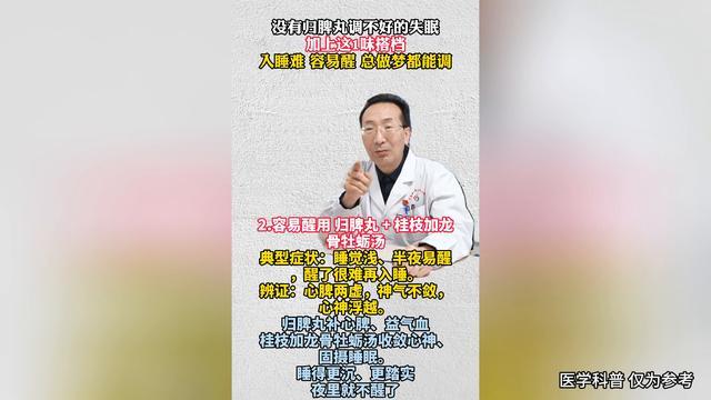 ·2.容易醒用归脾丸+桂技加龙骨牡蛎汤。典型症状:醒了很难再入睡。辨证:心脾两虚,神魂失养,心神浮越。归脾丸健脾益气、养血安神、固摄睡眠。睡得更沉、更踏实,夜里就不醒了。