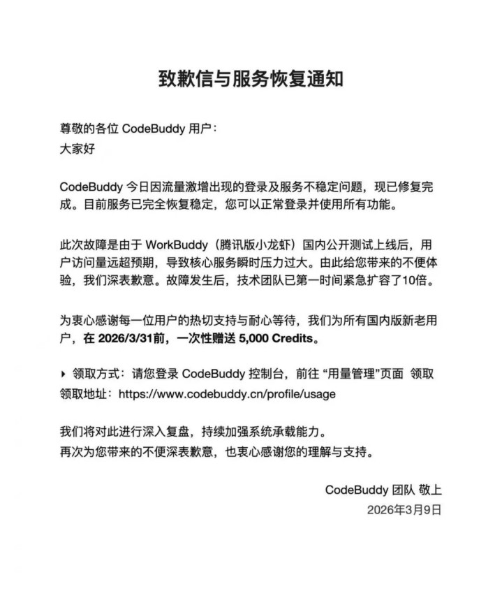 3月9日,微信公众号“腾讯云代码助手CodeBuddy”发布致歉信称,CodeBuddy(腾讯版小龙虾)当天因流量激增出现登录及服务不稳定问题,现已修复完成。目前服务已完全恢复稳定,可以正常登录并使用所有功能。